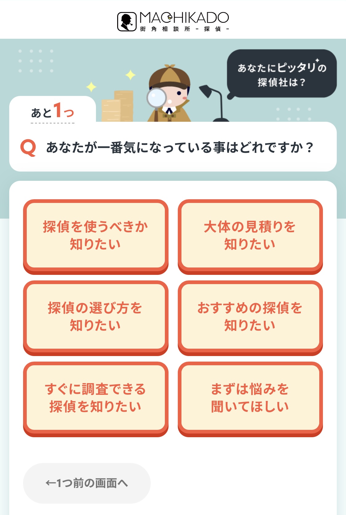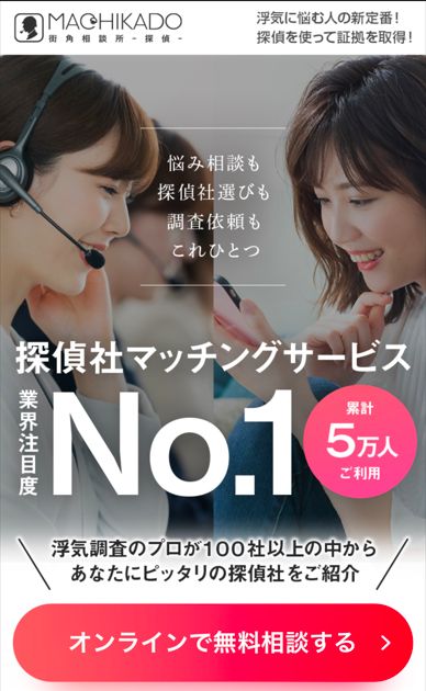 完全無料で悩みの相談、希望に合った優良探偵を紹介してくれるサービスです。